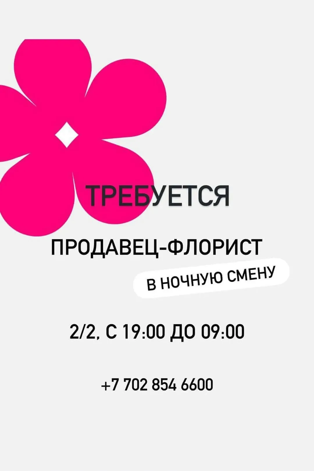 В цветочный магазин требуется продавец-флорист (ночная смена) График работы: 2/2, с 19:00 до 09:00 Мы предлагаем: ✨ Обучение - опыт работы не обязателен ✨ Стабильную работу на длительный срок ✨ Официальное трудоустройство ✨ Дружный коллектив Обязанности: - Продажа цветов и сборка букетов - Уход за цветами - Поддержание порядка на рабочем месте 📞 По всем вопросам: +7 702 854 6600